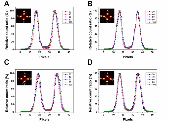 As shown in Figure 3, each BUR was clearly distinguished from the background region in each prompt gamma ray image. After we acquired the image profiles across the white dot line as shown in Figure 3, we performed the normalization of the image profiles using the highest peak value for each case. Although the standard of normalization for cases (a), (c), and (d) was 100 μg/g, for case (b), a 60 μg/g peak value was used as the standard of normalization.