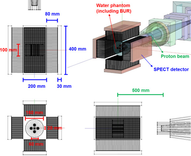 Figure 4: Schematic diagram of simulation for prompt gamma ray imaging using boron during proton irradiation. There are cross-sectional, ground, elevation diagram and three dimensional pictures of simulation geometry. The water phantom has a height of 100 mm and diameter of 160 mm with four boron uptake regions (BURs; diameter = 20 mm, height = 100 mm). Size of SPECT detector was 400 × 200 × 30 mm3. The distance between the center of phantom and the source was 500 mm.