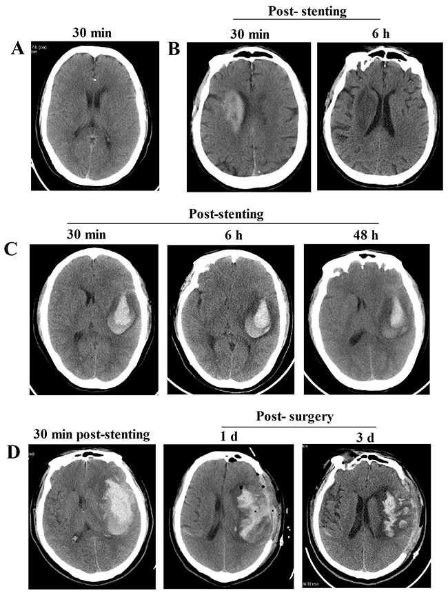 Multiple post-operation head CT features showed that high-density shadows were still increasing, and the mass effect was increasing during 24 h after stenting. |