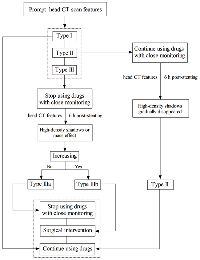 Figure 2 describes the evaluation procedure of the prompt CT features for the guidance of clinical treatment. If the prompt CT feature was Type I, the patients will continue regular anti-platelet (aspirin, 100 mg/day + clopidogrel, 75 mg/day, for 3 month) and anti-coagulation (enoxaparin, 40 mg/12 h, for 3 - 5 days) treatment; and when it was Type II, the patients will continue regular DAPT and anti-coagulation treatment with close monitoring based on the head CT reexamination; however, when it was Type III, the patients will first received single anti-platelet treatment (clopidogrel, 75 mg/d) with close monitoring when the 48-72 h post-stenting head CT scan showed that the hematoma was stabilized, if there was no expansion of hematoma within the next 5-7 d then added the other anti-platelet drug (aspirin, 100 mg/day) with close monitoring.