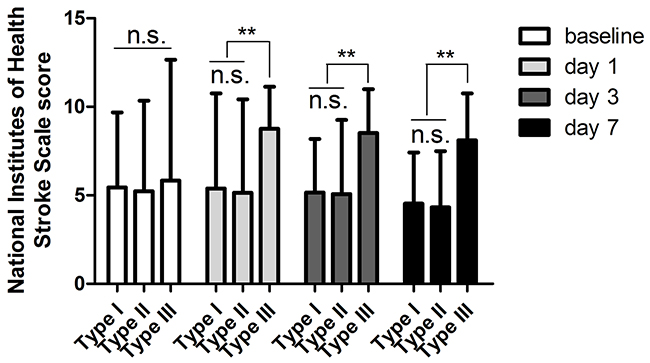 Figure 3: Better outcomes were obtained by comparing the NIHSS scores among the patients in Type I, Type II and Type III. n.s indicates non-significance, **p < 0.01.