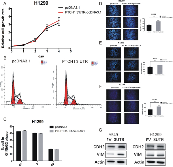 Figure 1: Overexpression of PTCH1 3’UTR promotes cell migration, invasion and adhesion in H1299. (A) Cell proliferation analysis was performed with CCK-8 assay in H1299 cells. Cells transfected with PTCH1 3’UTR or pcDNA 3.1 vector were seeded into 96-well plate at 5000 cells/well and examined at time points of 0h, 24h, 48h, 72 h and 96h. Overexpression of PTCH1 3’UTR had no significant difference with that transfected with pcDNA3.1. (B-C) Cell cycle assay was performed in H1299 cells. Cells were transfected with PTCH1 3’UTR or pcDNA 3.1 vector for 48 h, stained with PI and evaluated with a FACScalibur flow cytometer. Overexpression of PTCH1 3’UTR had almost the same population of cells in the G1 (resting), S (synthesis) and G2 (mitotic) phases with negative control. (D-F) Migrations, invasion and adhesion assay were performed in H1299 cells. Cells were transfected with PTCH1 3’UTR or control and seeded into the upper chamber of a transwell to count by transwell assay. Overexpression of PTCH1 3’UTR promotes cell migration, invasion and adhesion compared with negative control. Data are presented as the mean ± SD (n = 3). Significance was defined as p<0.05 (*, p < 0.05; **, p < 0.01; ***, p < 0.001). (G) Effect of PTCH1 3’UTR on the protein expression levels of CDH2 and VIM in A549 and H1299 cells using western blot analysis. β-actin was used as internal control.
