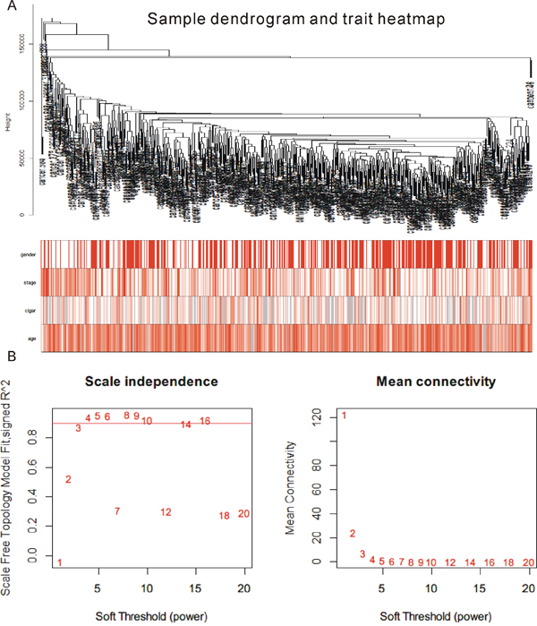 Figure 2: Result of WGCNA analysis. (A) Cluster result and trait heatmap of data samples. (B) Determination of parameter β of the adjacency function in the weighted gene correlation network analysis (WGCNA) algorithm.