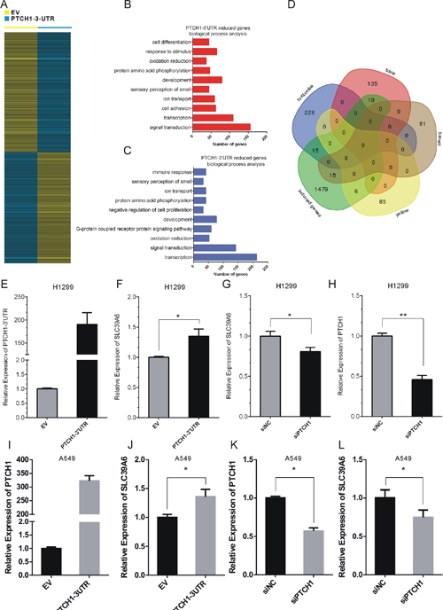Figure 4: PTCH1 3’UTR up-regulated SLC39A6 expression in NSCLC cells. (A) Identification of PTCH1 3’UTR regulated genes in H1299 cells. (B-C) GO analysis of up-regulated transcripts (B) and down-regulated (C) transcripts of PTCH1 3’UTR. Number of genes is indicated at x-axis. Up-regulated genes were enriched in the biological processes of signal transduction, cell adhesion and cell differentiation. Down-regulated genes were enriched in the biological processes of transcription, signal transduction and development. (D) Venn diagrams for combing the PTCH1 3’UTR inducing genes with previous module genes. 15 percent of genes in brown modules (15/96) were up-regulated after overexpressing PTCH1 3’UTR. (E-H) RT-PCR analysis of SLC39A6 and PTCH1 expression level after overexpression PTCH1-3’UTR or silencing PTCH1 in H1299 cells. (I-L) RT-PCR analysis of SLC39A6 and PTCH1 expression level after overexpression PTCH1-3’UTR or silencing PTCH1 in A549 cells. Data are presented as the mean ± SD (n = 3). Significance was defined as p<0.05 (*, p < 0.05; **, p < 0.01; ***, p < 0.001).