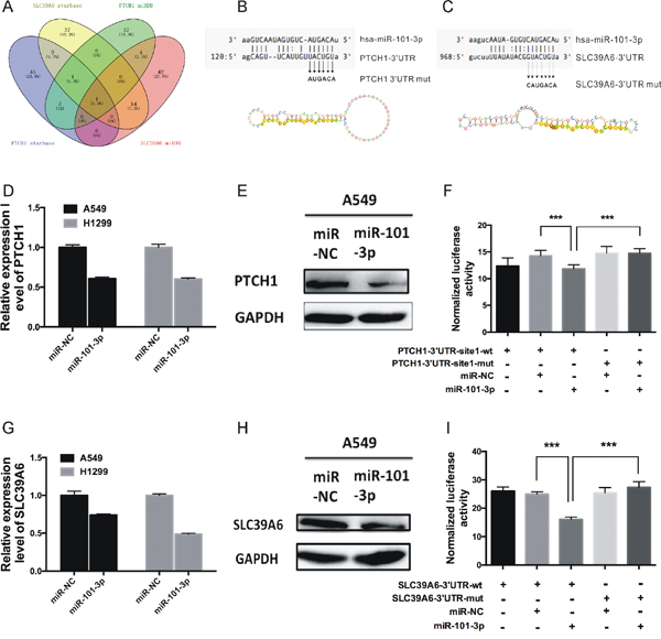 Figure 5: PTCH1 and SLC39A6 were direct targets of miR-101-3p. (A) Venn diagrams for miRNAs binding to both PTCH1 and SLC39A6 using two open-access, including miRDB and CLIP-seq database. (B-C) Sequence alignment of human miR-101-3p and 3’-UTR of PTCH1 and SLC39A6 using TargetScan and microRNA.org. The seed sequence of miR-101-3p (top) matches 3’-UTR of PTCH1(B, middle) and SLC39A6(C, middle). Bottom is the mutations of the 3’-UTR of PTCH1 and SLC39A6 used in luciferase reporter construct. (D-E and G-H) RT-PCR and western blotting analysis of PTCH1 and SLC39A6 mRNA and protein expression levels after overexpression miR-101-3p in A549 and H1299. GAPDH was used as internal control. (F, I) MiR-101-3p overexpression decrease the luciferase activity of PTCH1 and SLC39A6, but did not affect that of PTCH1-mut and SLC39A6-mut. Data are presented as the mean ± SD (n = 3). Significance was defined as p<0.05 (*, p < 0.05; **, p < 0.01; ***, p < 0.001).