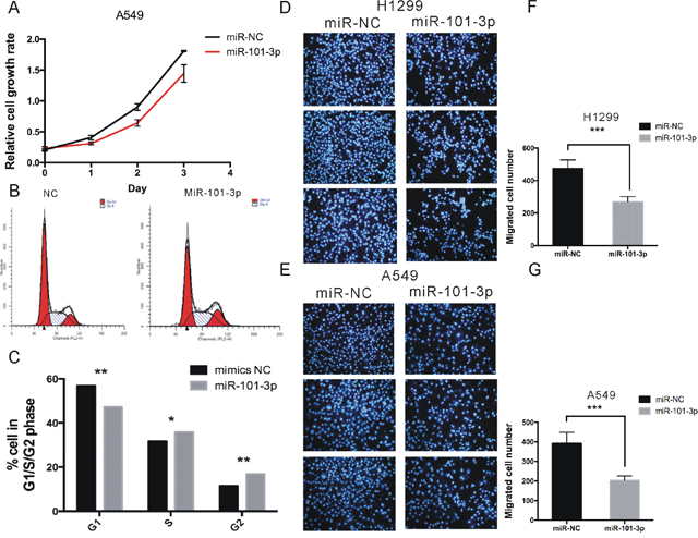 Figure 6: miR-101-3p suppresses proliferation, migration and invasion of NSCLC cells. (A) Cell proliferation analysis was performed with CCK-8 assay in A549 cells. Cells transfected with miR-101-3p or miR-NC were seeded into 96-well plate at 5000 cells/well and examined at time points of 0h, 24h, 48h and 72h. Overexpression of miR-101-3p significantly suppressed proliferation compared with that transfected with miR-NC. (B-C) Cell cycle assay was performed. Cells were transfected with miR-101-3p or miR-NC for 48 h, stained with PI and evaluated with a FACScalibur flow cytometer. Overexpression of miR-101-3p significantly induced the population of cells in the S/G1 compared with negative control. (D-G) Migrations assay were performed in H1299 and A549 cells respectively. Cells were transfected with miR-101-3p or miR-NC and seeded into the upper chamber of a transwell to count by transwell assay. Overexpression of miR-101-3p promotes cell migration compared with negative control. Data are presented as the mean ± SD (n = 3). Significance was defined as p<0.05 (*, p < 0.05; **, p < 0.01; ***, p < 0.001).