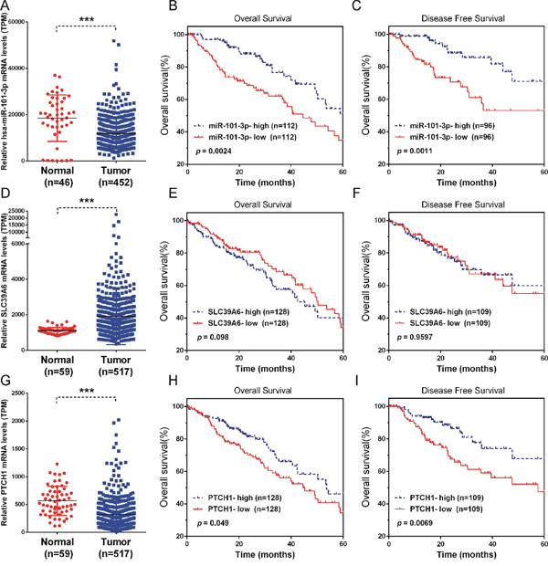Figure 8: Low miR-101-3p and PTCH1 and high SLC39A6 levels were positively correlated with NSCLC progression. (A, D, G) The expression of miR-101-3p, SLC39A6 and PTCH1 in NSCLC samples (n=452) compared to normal tissues (n=46). (B, C, E, F, H and I) Kaplan-Meier curves for survival time and disease-free survival time in patients with non-small cell lung cancer according to expression of miR-101-3p (B-C), SLC39A6(E-F), PTCH1 (H-I). Significance was defined as p<0.05 (*, p < 0.05; **, p < 0.01; ***, p < 0.001).