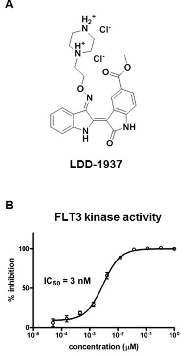 Figure 1: Structure of LDD1937 and its inhibitory effect on the FLT3 kinase activity. (A) Chemical structure of LDD1937 (B) Effect of LDD1937 on the in vitro FLT3 kinase activity. Inhibition of kinase activity of recombinant FLT3 was measured with the HTRF assay. Kinase inhibition was calculated with 1% DMSO as a negative control. Data are the mean ± SEM of three independent experiments.