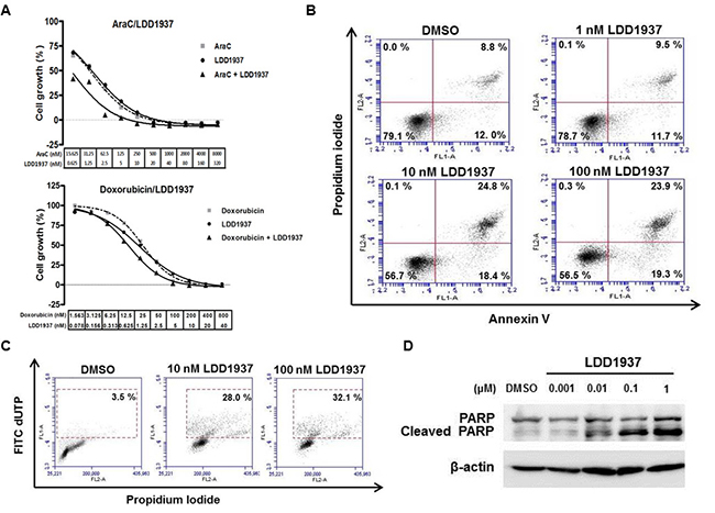 Figure 2: Effect of LDD1937 on the MV-4-11 cell growth and cell death. (A) MV-4-11 cells were treated with AraC, doxorubicin, or LDD1937 either alone or in combination at a fixed dose ratio of AraC vs. LDD1937 (ratio 25:1) and doxorubicin vs. LDD1937 (ratio 20:1) for 72 h at the indicated concentration, and the cell growth was measured. The CI value was calculated with the CompuSyn software. (CI < 1: synergistic; CI = 1: additive; CI > 1: antagonistic) (B) MV-4-11 cells were treated with LDD1937 at the indicated concentration for 24 h. The cells were stained with propidium iodide/Annexin V, and flow cytometry was performed. Bottom right quadrant (Annexin V+ and PI−): early apoptotic cells: top right quadrant (Annexin V+ and PI+): late apoptotic and already dead cells. (C) MV-4-11 cells were treated with LDD1937 for 24 h, and the TUNEL assay was performed as described in the Material and methods. The TUNEL positive population is indicated in the box with a dotted line. (D) MV-4-11 cells were treated with LDD1937 for 24 h, and PARP cleavage was measured by western blot analysis using an antibody that detects both the cleaved and uncleaved PARP.