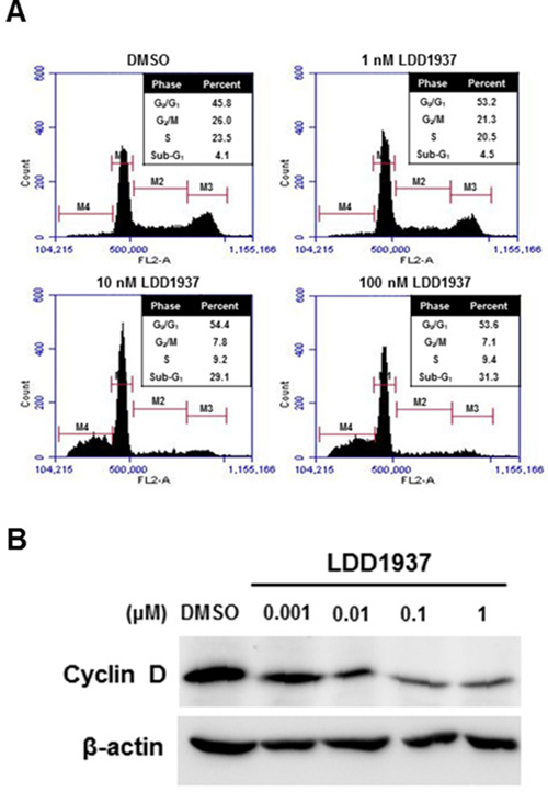 Figure 3: Effect of LDD1937 on the MV-4-11 cell cycle. (A) MV-4-11 cells were treated with LDD1937 for 24 h and stained with PI. Cells were then subjected to cell cycle analyses using a flow cytometer. M1: G1 phase, M2: S phase, M3: G2/M phase, M4: sub-G1 phase. (B) MV-4-11 cells were treated with LDD1937 at the indicated concentration for 16 h. Cyclin D1 levels were detected by western blot. As a loading control, the western blot of β-actin was done.
