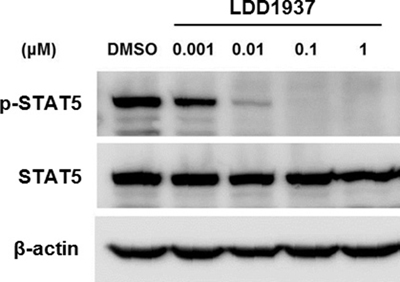 Figure 4: Effects of LDD1937 on the STAT5 phosphorylation. MV-4-11 cells were treated with LDD1937 for 4 h at the indicated concentration. Cell extracts were subjected to western blot using an antibody against phosphorylated STAT5 (p-STAT5) and STAT5. As a loading control, western blot of β-actin was done.
