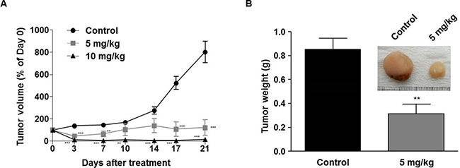 Figure 6: In vivo antitumor efficacy of LDD1937. MV-4-11 cells were inoculated subcutaneously into BALB/c nu/nu mice. When the tumor reached a mean volume of 100 mm3, mice were injected with 5 mg/kg or 10 mg/kg of LDD1937 or PBS (control) in the tail vein daily for 21 days. The tumor size was measured, and the tumor volumes were calculated (A). At day 21 after drug administration, mice were sacrificed, and the tumor weights measured (B). Representative image of a tumor mass dissected from the control and 5 mg/kg group was photographed (Inset). The data represent the mean ± SEM. **P < 0.01, ***P < 0.001 compared to the control, respectively.