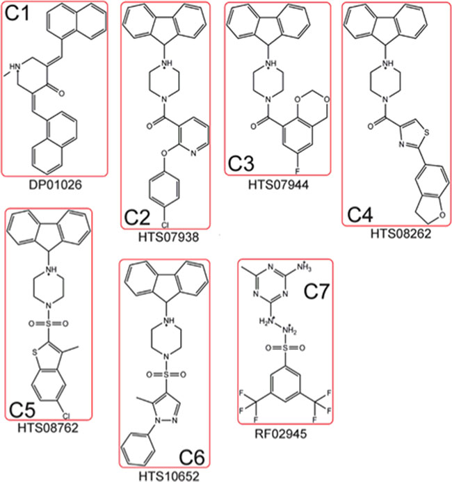 Figure 1: Dock derived compounds tested via in vitro screen. Dock derived compounds depicted with nicknames (C#) and Maybridge HitFinderTM designations. Structures were generated using ChemDraw.