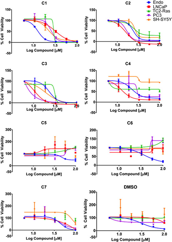 Figure 2: Dose response curves. Dose response curves for cell lines treated with 6, 10.5, 18.6, 32.4, 57.5, and 100 μM of compound (log) for 96 hours using % cell viability derived from CCK-8 absorbance readings at 450 nm (n = 3, mean ± SEM). A DMSO equivalent control (n = 2 ± SEM) was also included for each cell line tested: Ea.hy.926 endothelial cells (Endo), LNCaP androgen dependent metastatic prostate cancer cells, TC2-Ras mouse prostate cancer cells, PC-3 androgen independent metastatic prostate cancer cells, and SH-SY5Y neuroblastoma cells. Curves were fit using GraphPad Prism as described in the methods.