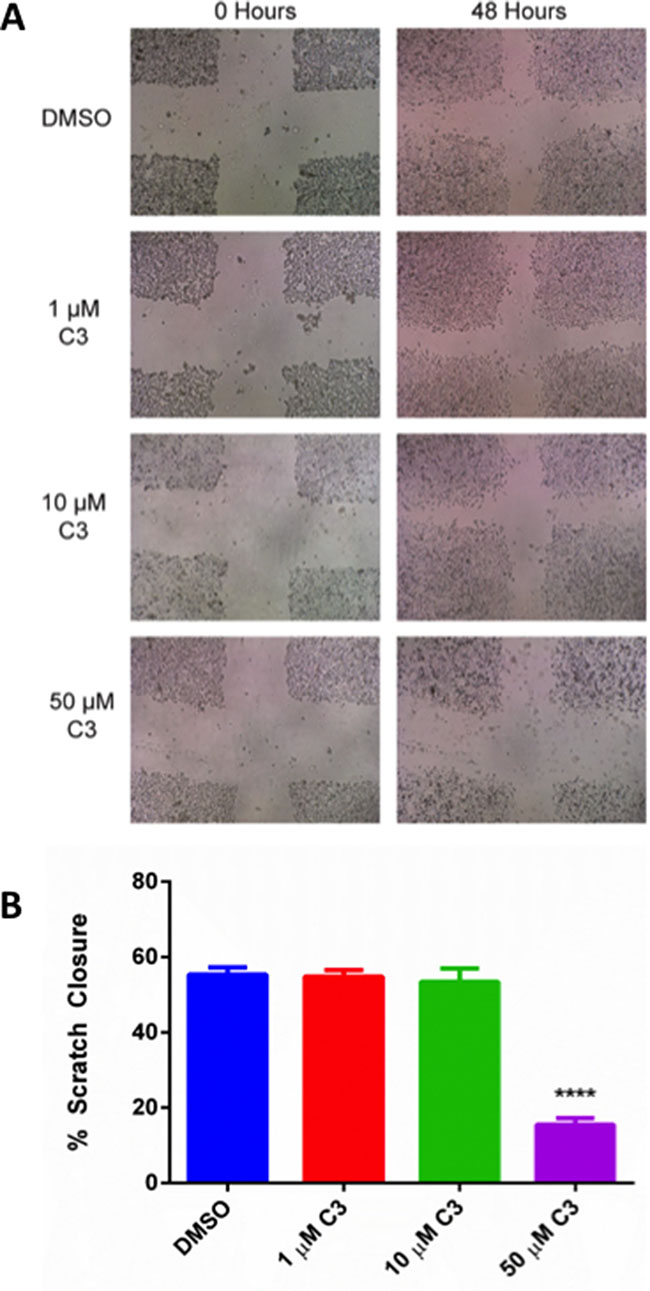 Docking the Maybridge HitfinderTM library against the 37 LR crystal structure using “Docking @ UTMB” generated 24 compounds with predicted docking scores ranging from –9.3 kcal/mol to –7.9 kcal/mol. After excluding compounds with poor chemical qualities, seven compounds were chosen for further in vitro studies. Notably, all compounds contained piperazine-like moieties (Figure 1) and had little to no preexisting data in the chemical literature. We carried out a 96 hour study of cell viability for the initial compound screen because we did not know the relationship between time and dose for the compounds selected a priori. A six-dose screen (6 μM to 100 μM) (Figure 2) separated compounds into two groups. C1, C2, C3, and C4 inhibited cell viability in a dose dependent manner whereas C5, C6, and C7 had mixed responses or did not inhibit cell viability in various cell lines. The vehicle, DMSO, had no effect on tumor cell lines LNCaP, TC2-Ras, PC-3, or SH-SY5Y but did have a mild effect on Ea.hy.926 endothelial cells at higher doses. IC50s obtained from dose response curves revealed that C3 had the strongest effect on cell viability in the majority of cell lines tested. C3 inhibited cell viability in the androgen dependent LNCaP cell line (10.28 μM), the aggressive and metastatic androgen independent PC-3 cell line (~0.8 μM), and in the neuroblastoma cell line SH-SY5Y (18.57 μM) (Table 1). Because C3 strongly inhibited cell viability in PC-3 cells, we chose to investigate the mechanism for reduction of cell viability using these cells.