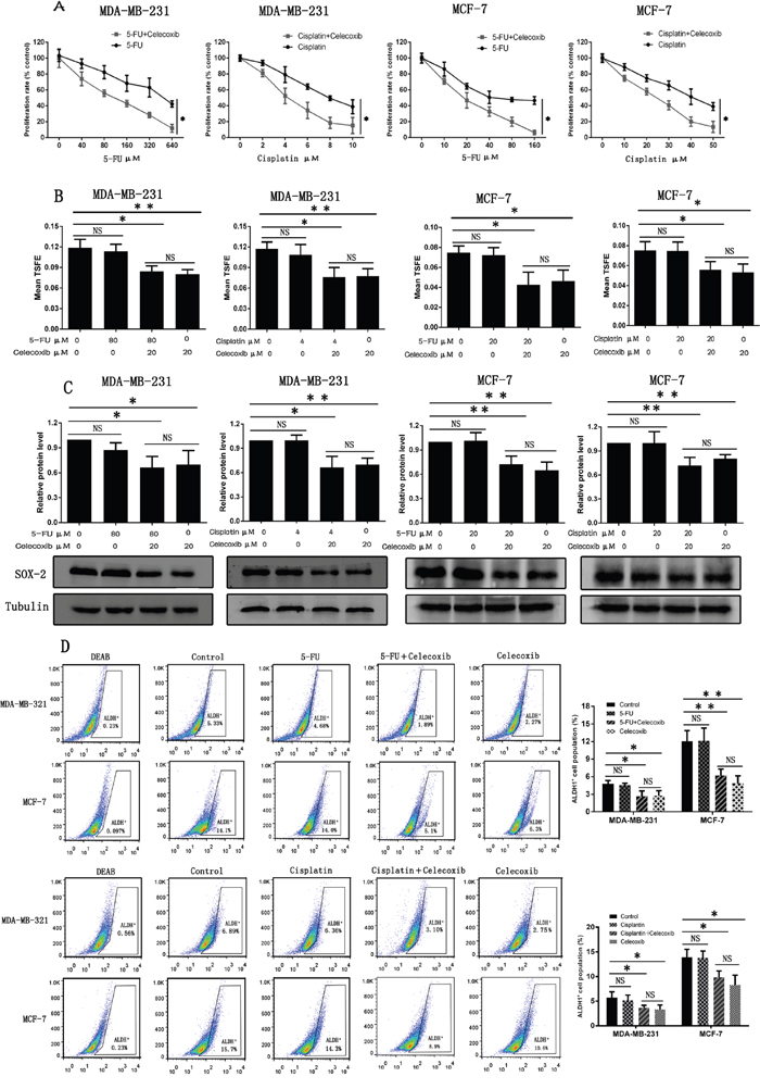 Figure 2: Celecoxib sensitizes breast cancer cells to chemotherapeutic drugs by selectively targeting CSCs. (A) CCK-8 was performed to evaluate cell proliferation of both MDA-MB-231 and MCF-7 cells after being treated with various concentrations of chemotherapeutic drugs (5-FU, cisplatin) alone or in combination with 20 μM celecoxib. (B, C and D) Non-adherent tumorsphere formation assay, western-blot assay and flow cytometry analysis were performed to evaluate the effects of celecoxib on CSCs. MDA-MB-231: 5-FU, 80 μM; cisplatin, 4 μM; Celecoxib, 20 μM. MCF-7: 5-FU, 20 μM; cisplatin, 20 μM; Celecoxib, 20 μM. Data are presented as the means ± SD from three independent experiments; *, P < 0.05; **, P < 0.01; NS, Non statistical significance.