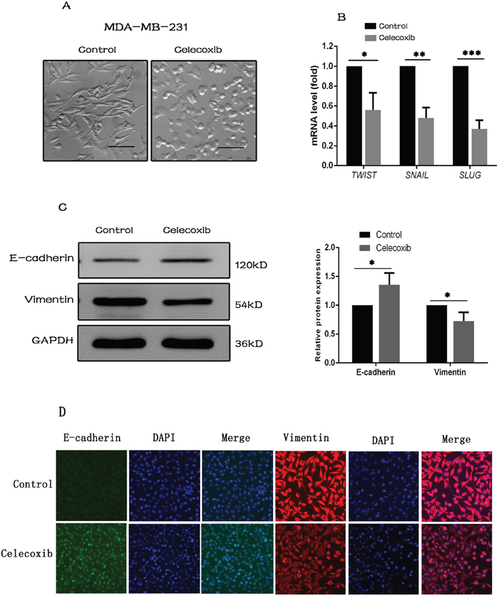 Figure 3: Celecoxib inhibits EMT gene signature. (A) Morphological changes of MDA-MB-231 cells treated with celecoxib (magnification, ×100). (B) Relative mRNA expressions of mesenchymal makers including SNAIL, SLUG, and TWIST following celecoxib treatment. (C and D) The protein expression changes of E-cadherin and Vimentin following celecoxib treatment. Scale bar = 50 μm. Data are presented as the means ± SD from three independent experiments; *, P < 0.05; **, P < 0.01; ***, P < 0.001.