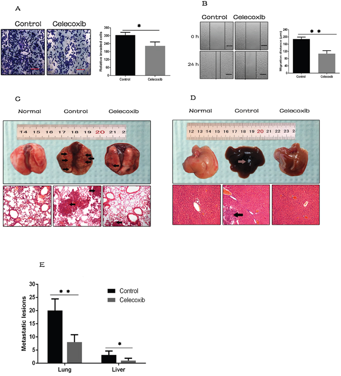 Figure 4: Celecoxib attenuates breast cancer cell metastasis. (A and B) The effect of celecoxib on invasion and migration of MDA-MB-231 cells was measured by the transwell assay and wound healing assay respectively (magnification, ×100). (C and D) The effect of celecoxib on breast cancer cell metastasis was analyzed in vivo. Arrows indicate surface metastatic lesions on the lungs and livers, and metastatic lesions were confirmed by H&E staining (magnification, ×100). Normal lung and liver tissues were used as negative control. (E) Number of visible surface metastatic lesions on lungs and livers of individual mice were counted. Scale bar = 100 μm. Data are presented as mean ± SD. *, P < 0.05; **, P < 0.01; ***, P < 0.001.