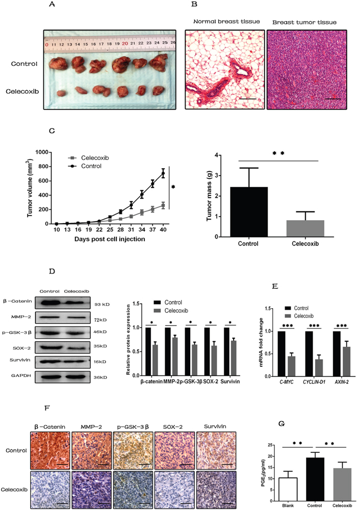 Figure 6: Celecoxib inhibits tumorigenesis in vivo by inhibiting the synthesis of PGE2 and down-regulating the Wnt pathway activity. (A) Photographs of excised tumors from two groups of NOD/SCID mice (N = 6 per group). (B) Tumor tissues were confirmed by H&E staining, and normal breast tissues were used as negative control (magnification, ×100). (C) Tumor growth was measured with a caliper every three days, and tumors were weighted when the mice were sacrificed. (D and E) Proteins and RNAs were extracted from tumor tissues. Wnt pathway components (β-catenin, p-GSK-3β) and target genes (MMP-2, Survivin, AXIN-2, CYCLIN-D1 and C-MYC), and CSC marker (SOX-2) were evaluated by western-blot or RT-PCR. (F) IHC staining for Wnt pathway components, target genes and CSC marker (SOX-2) in sections of tumor tissues (magnification ×200). (G) PGE2 levels in serum of the assayed animals were evaluated by PGE2 ELISA kit. Scale bar = 100 μm. Data are presented as mean ± SD. *, P < 0.05; **, P < 0.01; ***, P < 0.001.