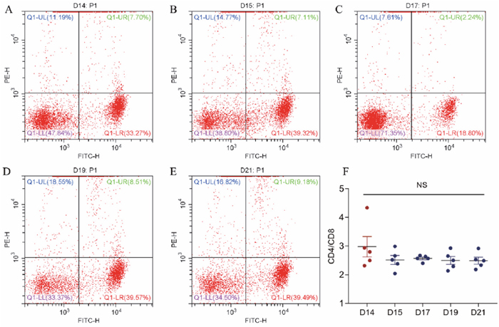 Figure 2: The effect of cold stress on the expression of CD4 and CD8 antigen on T cells in peripheral blood. (A, B, C, D, E) Representative figures from GD14 to GD21 flow cytometry analyses. (F) Analyzed data of CD4/CD8 ratio. Values are expressed as means ± SD (n = 5).
