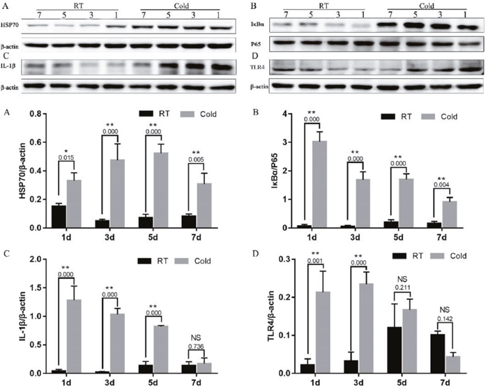 To further investigate the prenatal stress inflammatory mechanism, we examined the HSP70/TLR4/NF-κB signaling pathway, by measuring placental HSP70, TLR4, IκB, IL-1β, and P65 protein levels. As shown in Figure 3, prenatal cold stress enhanced HSP70 (Figure 3A, P < 0.015) and IκBα expression (Figure 3B, P < 0.004). We also demonstrated that IL-1β levels increased after cold-stress periods of 1, 3, and 5 days (Figure 3C, P=0.000), and that they decreased after 7 days of cold stress (Figure 3C, P=0.726). Interestingly, placental TLR4 expression followed a similar trend after cold-stress periods of 1 (P=0.001) and 3 (P=0.000) days (Figure 3D), these results were possible followed the CORT levels. Our results indicate that prenatal cold stress induced activation of NF-kB via HSP70/TLR4/NF-κB signaling pathways in the placenta.