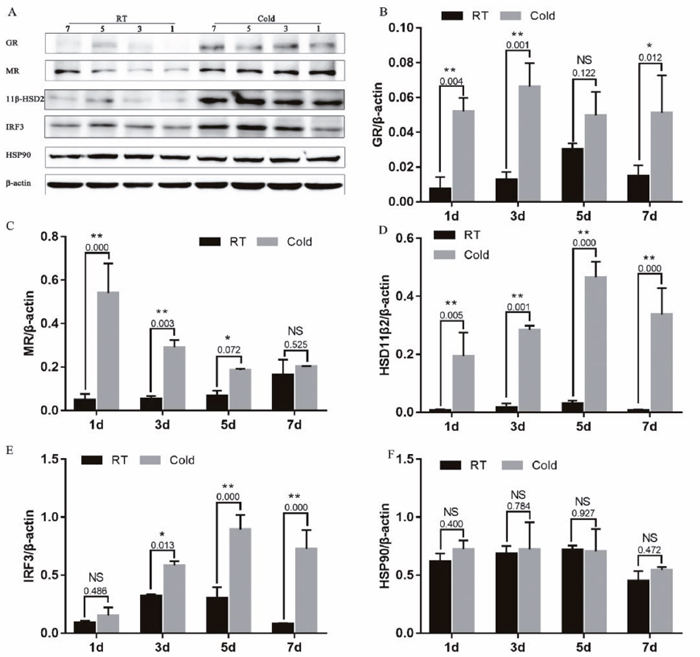As shown in Figure 4, prenatal cold stress had a significant effect on grey intensity values of GR (Figure 4B) after 1 (P=0.004), 3 (P<0.001) and 7 (P<0.012) days of cold stress, MR (Figure 4C) after 1 (P=0.000), 3 (P=0.003) and 5 (P=0.072) days of cold stress, and 11β-HSD2 (Figure 4D, P < 0.005). Furthermore, we measured levels of IRF3, an interferon regulatory factor, and levels of HSP90. There was no effect on IRF3 of cold stress 1d (P=0.486), as the duration of cold stress was extended, placental IRF3 expression significantly increased (Figure 4E, P < 0.013). However, cold stress had no significant effect on HSP90 expression (Figure 4F, P>0.400).