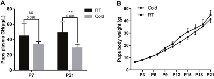 Figure 6: Prenatal cold stress decreased plasma GH levels and the body weight of offspring. (A) ELISA detection for 7 and 21 d old pups’ plasma GH levels (n=6-10). (B) Pups’ body weight growth curve (from postnatal days 1 to 21) (n=30). The data are presented as mean ± SD. Statistically significant differences are indicated: *P < 0.05, **P < 0.01.