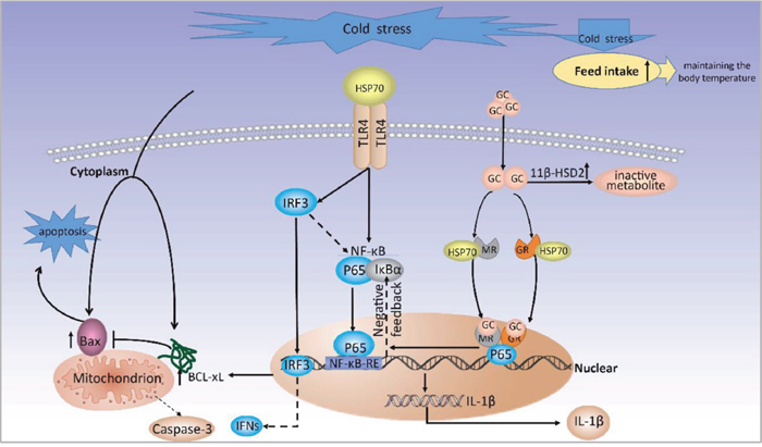 Heat shock protein 70 (HSP70), plays an important role in protein trafficking and the refolding of denatured proteins during stress, which can activate the TLR4 signaling pathway and subsequently induce proinflammatory cytokine production via NF-κB and IRF-3 signal pathways [10, 11]. But it is not clear the hypothesis behind to the effects of cold stress on HSP70 and proinflammatory cytokine production. Moreover, apoptosis can be triggered by a variety of factors, such as reactive oxidative stress [12] and inflammatory response [13]. However, research on the effects of cold stress in gestation on placental apoptosis is limited. The present study focused on the maternal response to prenatal cold stress and the data from offspring will be included in future studies.