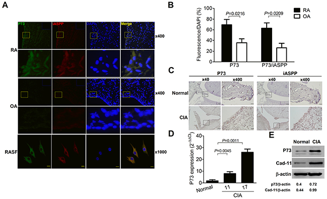 Figure 1: Increased p73 levels with co-localized iASPP expression in the rheumatoid joint. (A) Immunofluorescence staining of p73 (green, FITC), iASPP (red, Texas red) and nucleus (blue, DAPI) in RA and OA synovial tissues (×400 magnification). The yellow-boxed areas in upper panels are magnified and shown in lower panels (×1,600 magnification). The blue-rectangled areas in the right upper corner of upper panels are isotype control IgG staining of p73 and iASPP. Immunofluorescence staining of p73 (green, Alexa Fluor 488), iASPP (red, Alexa Fluor 594) and nucleus (blue, DAPI) in RASF (×1,000 magnification, scale bar = 20 μm). (B) p73- or p73/iASPP double positive frequencies of DAPI-positive cells in synovial tissues. Each value represents the mean and SEM (n = 7). (C) Immunohistochemical detection of p73 and iASPP in synovial tissues of normal and CIA rats. Scale bars represent 500 and 50 μm in ×40 and ×400 magnifications, respectively. The boxed areas in left panels are magnified and shown in right panels. (D) Quantitative real-time PCR analysis of p73 levels from synovial tissues of normal and CIA rats. Each value represents the mean and SEM (n = 5). (E) Representative immunoblot photographs of p73 and cadherin-11 (Cad-11) expression in SFs from normal and CIA rats. The results in A to E are representative of at least two independent experiments with similar findings.