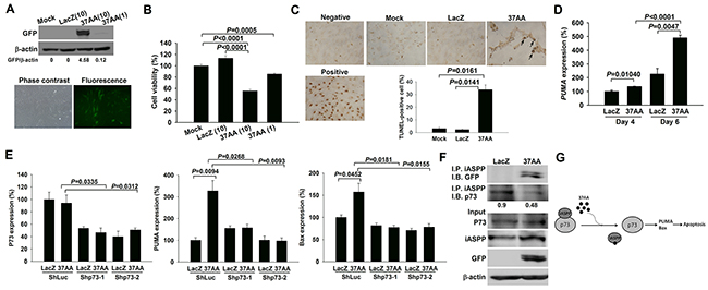 Figure 2: Induction of apoptosis in SFs by the activation of p73. (A) Immunoblot and immunofluorescence analyses reveal a high efficacy of Ad37AA transfection in CIASFs with expression of GFP protein and green fluorescence, respectively. (B) Cell viability is expressed as the percentages of surviving cells relative to those in mock cells. Each value shown in B represents the mean and SEM (n = 6). (C) TUNEL-positive cells were observed after the transfection of Ad37AA at a MOI of 10 for 7 days. DNase-treated cells were used as a positive control. Arrows indicate positive cells. Percentages were determined by averaging TUNEL-positive cells in 3 randomly selected fields at the ×100 magnification (n = 3). (D) Quantitative real-time PCR analysis demonstrates PUMA expression levels in Ad37AA-transduced CIASFs for 4 and 6 days. Each value shown represents the mean and SEM (n = 8). (E) Quantitative real-time PCR analysis reveals p73, PUMA and Bax expression levels in p73-silenced and control CIASF transfectants transduced with Ad37AA or AdLacZ for 6 days (n = 5). (F) Representative immunoblot photographs of iASPP-associated p73 expression in Ad37AA-treated CIASFs. Input represents the loading control. AdLacZ-transfected CIASFs were served as a control group in A to D. (G) A schematic diagram shows the dissociation of the binding with iASPP by overexpressing 37AA to activate p73 and induce apoptosis in SFs. The results in A to F are representative of at least two independent experiments with similar findings.