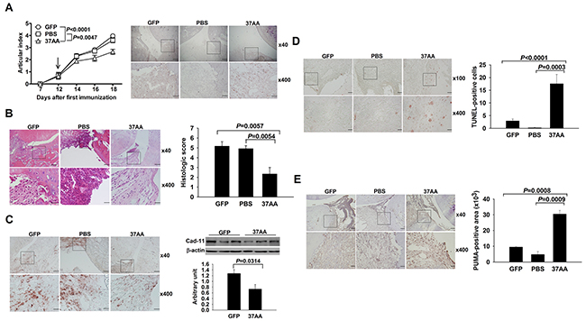 Figure 3: Amelioration of experimental arthritis by i.a. activation of p73. (A) Left, Reduced articular indexes in Ad37AA-injected CIA joints as compared with AdGFP (P < 0.0001) or PBS (P = 0.0047) control joints. Right, Representative GFP immunohistochemical photographs of CIA joints. (B) Representative H&E photographs and histologic scores in Ad37AA-injected CIA and control joints. (C) Left, Representative cadherin-11 (Cad-11) immunohistochemical photographs of CIA joints. Right, Immunoblot analysis of Cad-11 in CIA synovial extracts with quantification of the band intensity by comparing with β-actin. (D) Representative in situ apoptosis photographs and calculated TUNEL-positive cell numbers in CIA joints. (E) Immunohistochemical intensity with representative photographs of PUMA expression in CIA joints. CIA joints receiving different treatments were obtained on day 18 upon sacrifice. Scale bars represent 500, 200, and 50 μm in ×40, ×100 and ×400 magnifications, respectively. Each value in the graphs represents are mean and SEM (n = 8 in A and B, n = 3 in C, n = 5 in D and E). The results in A to E are representative of two independent experiments with similar findings.