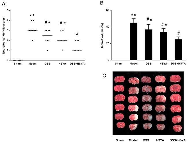 Figure 1: Neurological deficit evaluation (A) and infarct volume ratio by TTC staining (B, C). (A) The neurological scores after MACO in each group (n=8). Neurological scores were expressed as median (range); *P < 0.05, **P < 0.01 compared with model group. (B, C) The infarct volume ratios in each group. #P < 0.05 vs. model group; *P < 0.05 vs. DSS+HSYA group. **P < 0.01 vs. sham group.