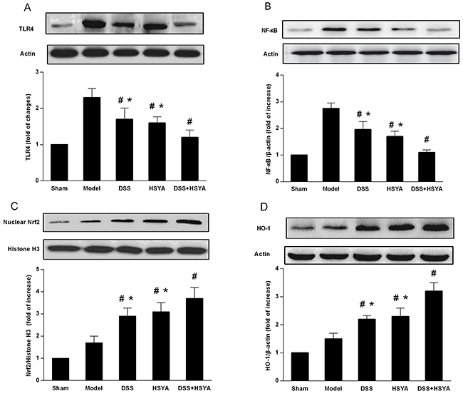 Figure 3: Western blot analysis of DSS and HSYA on the protein levels of (A) TLR4; (B) NF-κb; (C) Nrf2; (D) HO-1. #P < 0.05 vs. model group; *P < 0.05 vs. DSS+ HSYA group.