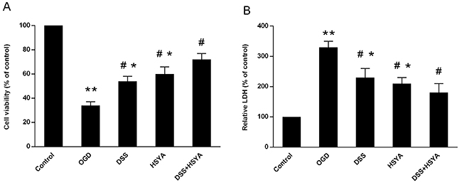 Figure 4: Cell viability (A) and LDH release (B) in primary culture of rat cortical neurons. The control group (normal cell group) was defined as 100%. Data represent means ± SD of triplicate independent experiments. #P < 0.05 vs. OGD group; *P < 0.05 vs. DSS+ HSYA group.