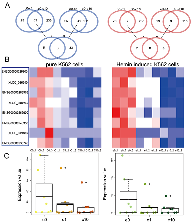 Figure 2: Dysregulated lncRNAs in pure and hemin-induced K562 cells. Venn diagrams showing differentially expressed lncRNAs shared among four groups, including pure K562 cells and those treated with 1 uM DHA (c0-c1), pure K562 cells and those treated with 10 uM DHA (c0-c10), hemin-induced K562 cells and those treated with 1 uM DHA (e0-e1), and hemin-induced K562 cells and those treated with 10 uM DHA (e0-e10) (A) Heat maps of dysregulated lncRNAs in pure and hemin-induced K562 cells (B) Red and blue colors in (A) and (B) represent upregulated and downregulated lncRNAs, respectively. Boxplots showing differentially expressed lncRNAs (C) Darker color represents treatment with higher DHA concentrations. Yellow and green represent pure and hemin-induced K562 cells, respectively.