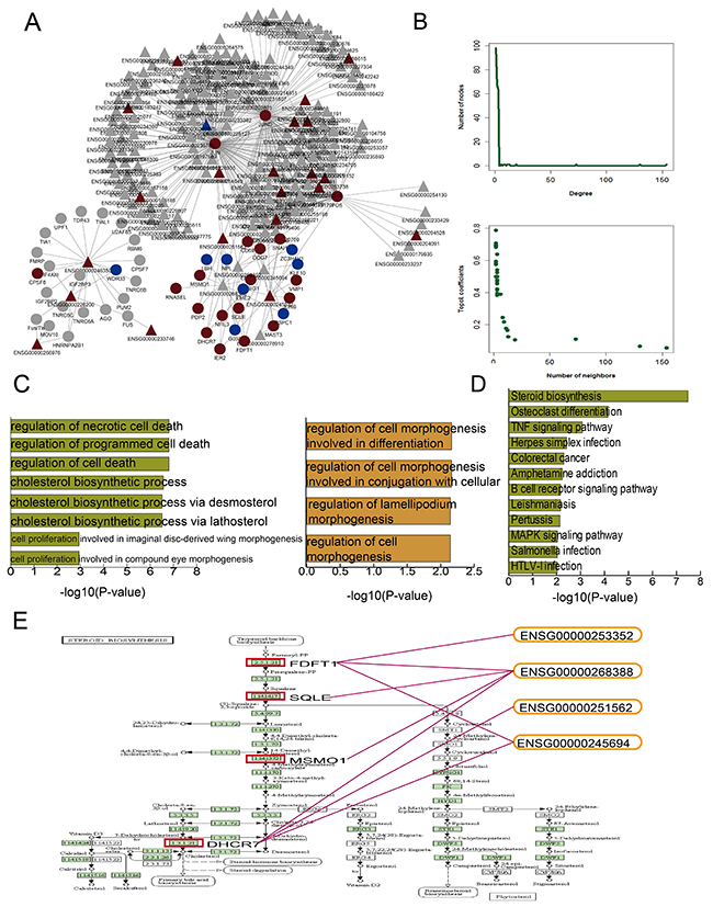 Figure 3: DHA-related mRNA-lncRNA network and functional analysis. DHA related mRNA-lncRNA regulation network (A) Nodes represent candidate DHA targets in K562 cells. Circular and triangle nodes represent mRNAs and lncRNAs, respectively. Red and blue colors represent up- and downregulation, respectively. Basic network features, including degree and topological coefficients (B) Pathways enriched for differential mRNAs (C) and GO terms enriched for differential mRNAs (green) and lncRNAs (yellow) (D) are ranked by -log10(P) and shown as bar plots. The steroid biosynthesis pathway shows four key dysregulated mRNAs (red rectangles) regulated by four dysregulated lncRNAs (E).