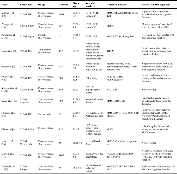 68. Feinkohl I, Keller M, Robertson CM, Morling JR, Williamson RM, Nee LD, Mclachlan S, Sattar N, Welsh P, Reynolds RM. Clinical and subclinical macrovascular disease as predictors of cognitive decline in older patients with type 2 diabetes: the Edinburgh Type 2 Diabetes Study. Diabetes Care. 2013; 36:2779–86.