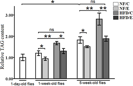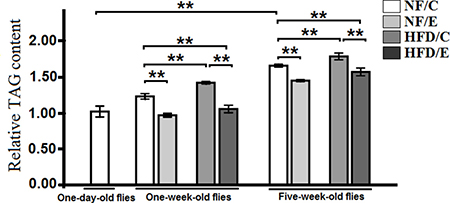Figure 1: The relative TAG content in Drosophila. The relative TAG levels were assessed at one-day old flies, one-week old flies, and five-week old flies. The relative TAG levels were normalized with fly weight. Independent-sample t-tests were used to assess differences in 1-day old and 5-week old in the NF/C group flies. Using a one-way analysis of variance (ANOVA) followed by an LSD test among the group NF/C, NF/E, HFD/C, and HFD/E. Sample size was 35 to 40 flies per group. Data are represented as means ± SEM. *P < 0.05; **P < 0.01.