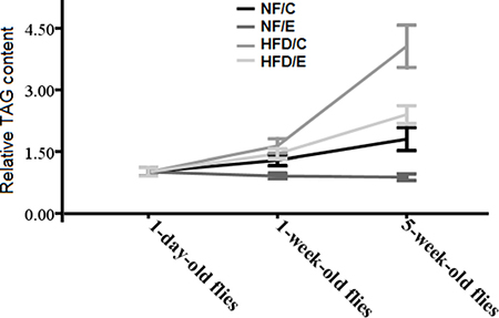 Besides, in 1-week-old flies, the relative TAG content in NF/E group flies was lower than NF/C group flies (LSD test, P < 0.05); the relative TAG content in HFD/C group flies was higher than NF/C group flies (LSD test, P < 0.01); the relative TAG content in HFD/E group flies was higher than HFD/C group flies (LSD test, P < 0.05), and there was no significant difference between NF/C group flies and HFD/C group flies in the relative TAG content(LSD test, P > 0.05) (Figure 1).