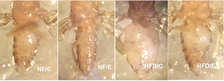 Figure 3: 5-week old flies in different groups. This picture clearly showed that HFD induced a higher body fat accumulation, but endurance exercise could reduce fat content and maintain lipids at a lower level.