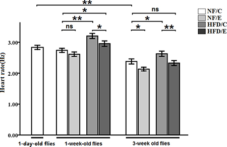 Figure 7: Effects of HFD and endurance training on heart rate at one-day old flies, one-week old flies, and five-week old flies. Independent- sample t-tests were used to assess differences between 1-day-old flies and 5-week-old flies. Using a one-way analysis of variance (ANO VA) followed by an LSD test among the NF/C, NF/E, HFD/C, and HFD/E group flies. Sample size of heart rate was 30 flies per group. Data are represented as means ± SEM. *P < 0.05; **P < 0.01.
