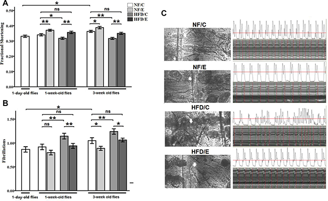 Figure 8: Effects of endurance training and HFD on fraction shortening and fibrillation at one-day old flies, one-week old flies, and five-week old flies. (A) Fraction shortening. (B) Fibrillation. (C) Effects of HFD and endurance training on the fat storage in non-adipose tissue heart and percardial cells at five-week old. Heart and percardial cells were observed clearly in NF/C flies. Heart and percardial cells were also observed clearly in NF/E flies. Heart and percardial cells could not be observed clearly in HFD/C flies since there were much fat storage in non-adipose tissue heart and percardial cells after five-week HFD, and the heart would be damaged even though this fat was removed very carefully in order to see the heart tube clearly. Independent-sample t-tests were used to assess differences between 1-day-old flies and 5-week-old flies. Using a one-way analysis of variance (ANOVA) followed by an LSD test among the NF/C, NF/E, HFD/C, and HFD/E group flies. Sample size was 30 flies per group. Data are represented as means ± SEM. *P < 0.05; **P < 0.01.