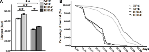 Independent-sample t-tests were used to assess differences between the 1-day-old control group and 5-week-old control group. A 3-way ANOVA was used to identify differences among the NF/C, NF/E, HFD/C, and HFD/E groups at different ages. 1-way analysis of variance (ANOVA) with least significant difference (LSD) tests was used to identify differences among the NF/C, NF/E, HFD/C, and HFD/E groups. Log-rank test was used to identify differences among the NF/C, NF/E, HFD/C, and HFD/E groups longevity. Analyses were performed using the Statistical Package for the Social Sciences (SPSS) version 16.0 for Windows (SPSS Inc., Chicago, USA), with statistical significance set at P < 0.05. Data are represented as means ± SEM.