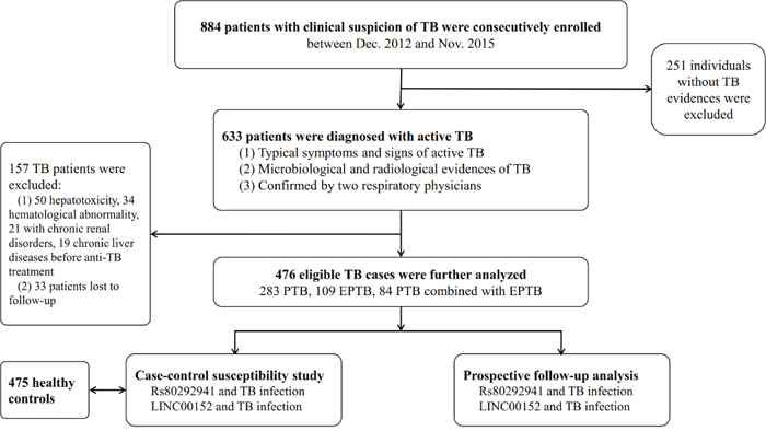 In our prospective observational study, we preliminarily enrolled 884 patients and 475 unrelated healthy controls from the West China Hospital of Sichuan University in western China from Dec. 2012 to Nov. 2015. TB diagnoses were made for 633 patients based on typical symptoms of active TB disease and based on the identification of microbiological and radiological evidence of active TB. All cases of active TB were confirmed by two experienced respiratory physicians. Regimens with antituberculosis drugs (ATDs) were administered for four or more months, according to the clinical practices recommended by the World Health Organization (WHO) [35]. Patients meeting the following criteria were excluded: (a) no microbiological or radiological evidence of TB; (b) signs of hepatotoxicity, renal injury, and hematological toxicity prior to anti-TB chemotherapy; (c) positive serological testing for HIV, HBV, or HCV; (d) history of chronic liver/kidney/hematological system disease; (e) pregnancy; (f) poor adherence to treatment or to one-year follow-up observations. Controls were recruited from healthy blood donors who had negative interferon gamma release assay (IGRA) results, normal physical examination results, and no history of TB.