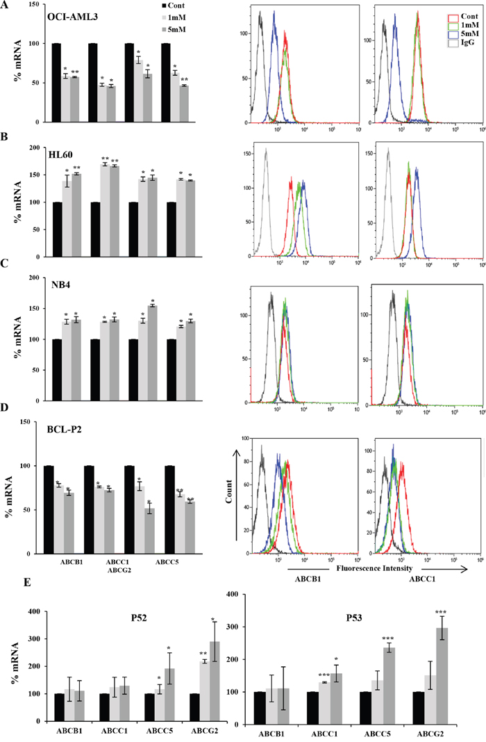 Figure 1: DCA-induced ABC transporters expression depended on p53 status in leukemic cells. Different hematopoietic cell lines OCI-AML3 wtp53 (A), HL-60 nullp53 (B), NB4 mutp53 (C) and primary cells from BCL-P2 wtp53 patient (D) or B-CLL mutp53 patients were treated with 1 and 5 mM DCA for 1 week and RNA and plasma protein levels were analyzed by qPCR or FACS respectively. Data represent the % of mRNA compared to control cells. The bar graphs represent means ± SD of 3 independent experiments performed in triplicate; *p<0.05, **p<0.01, ***p<0.005 student t-test compare to control cells.