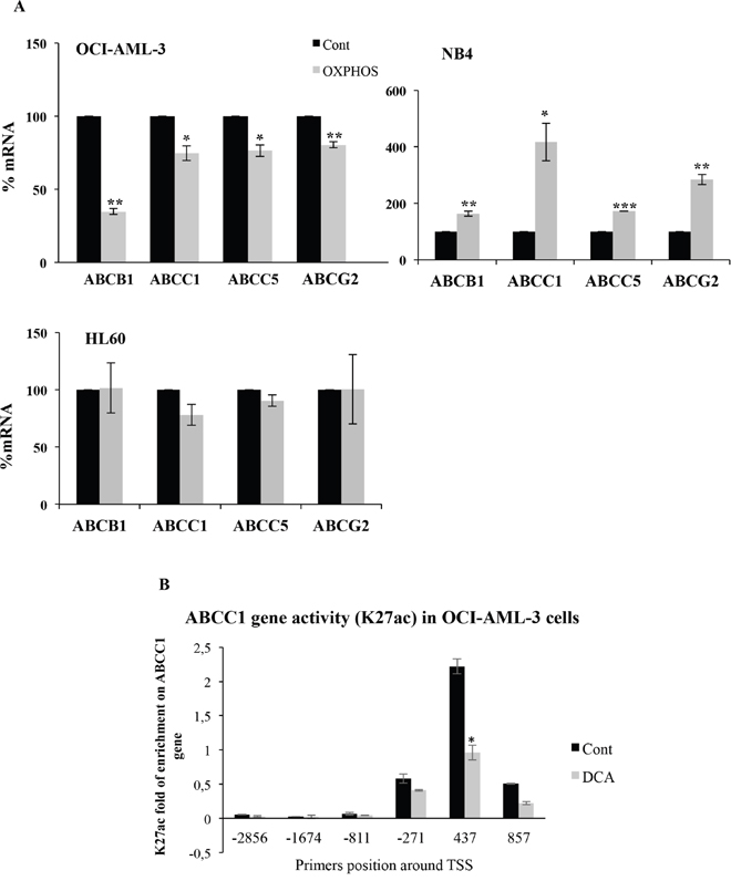 Figure 2: OXPHOS inhibited or stimulated ABC expression in wtp53 or mutp53 cells, respectively. (A) OCI-AML3, NB4 and HL60 cells were grown in OXPHOS medium for 2 weeks and expression of ABC transporters was analyzed as in Figure 1. The bar graphs represent means ± SD of 3 independent experiments performed in triplicate; *p<0.05, **p<0.01, ***p<0.005 student t-test compare to control cells. (B) Cells were treated with 5 mM DCA for 3 days and processed for ChIP analysis. The enrichment of K27 acetylation on Histone 3 in the ABCC1 promoter was analyzed as described in material and methods by using different primers around the transcription start site (TSS).