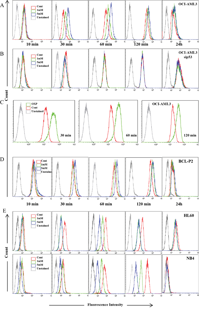 Figure 5: Metabolism-controlled drug outtake depended on p53 status. (A, B, D and E) Different cell lines were treated with 5 mM DCA for 7 days or incubated in OXPHOS medium for 14 days (C). In (B), OCI-AML3 cells were transfected with a siRNA for p53 (sip53) 48 h before treatment. Cells were then incubated with 5 uM daunorubicin and clearance was measured at various time points (10, 30, 60, 120 minutes). Some cells were incubated with 1uM daunorubicin for 24 h. Experiments were repeated at least three times.
