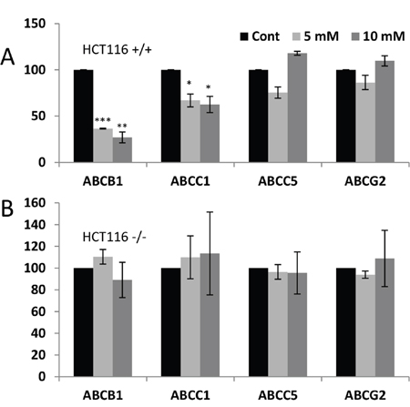 Figure 6: DCA-induced ABC transporters expression required wtp53. (A and B) Two isogenic colon cancer cell lines (p53+/+ and p53-/- HCT116 cells) were treated with 1 and 5 mM DCA for 1 week and RNA was analyzed by qPCR. Data represent the % of mRNA compared to control cells. The bar graphs represent means ± SD of 3 independent experiments performed in triplicate; *p<0.05, **p<0.01, ***p<0.005 student t-test compare to control cells.