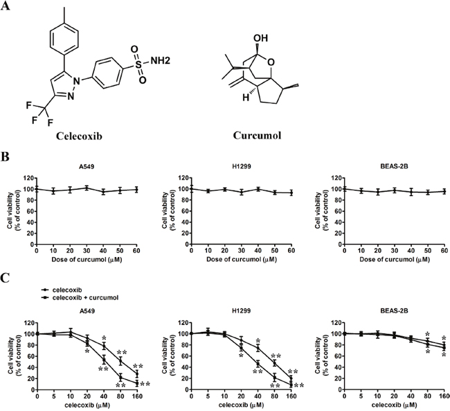 Figure 1: Effect of celecoxib and curcumol on the growth of tumor cells in vitro. (A) Chemical structure of celecoxib and curcumol. (B) A549 cells, H1299 cells and BEAS-2B cells were treated with curcumol at different concentrations (0, 10, 20, 30, 40, 50, 60 μM) for 24 h, and the cell viability was assessed by MTT assay. (C) A549 cells, H1299 cells and BEAS-2B cells were treated with indicated concentrations (0, 5, 10, 20, 40, 80, 160 μM) of celecoxib for 24 h in the absence or presence of 30 μM curcumol. The cell viability was assessed by MTT assay. Data are represented as mean ± SD. *p < 0.05, **p < 0.01.