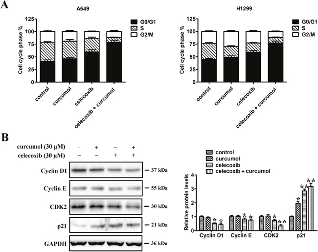 Figure 5: Effect of celecoxib and curcumol on cell cycle distribution. (A) A549 and H1299 were treated with celecoxib (30 μM) and/or curcumol (30 μM) for 24 h. The cells were then fixed with 70% ethanol and stained with PI. The cell cycle distribution (G0/G1, G2/M and S) was determined by flow cytometry. (B) Western blotting was also performed to detect the levels of cell cycle regulators (cyclin D1, cyclin E, cdk2 and p21). Band intensity was quantified by Image J software. The results shown are representative of three different experiments. Data are represented as mean ± SD, *p < 0.05, **p < 0.01.